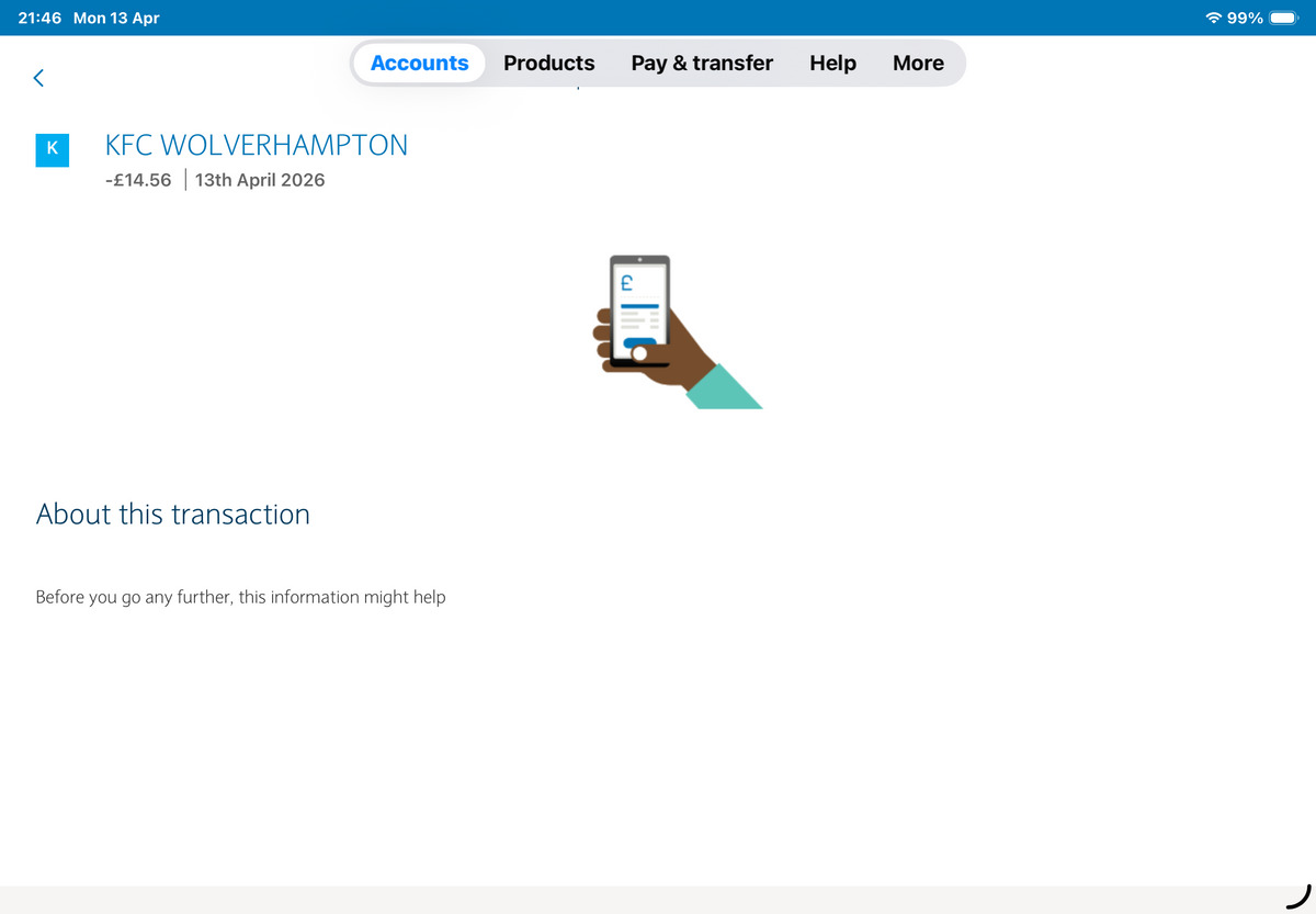 Today KFC chicken Used card no receipt but can provide bank statement if required. Did not taste like normal KFC.. Penn Retail Park, 4 Penn Rd, Wolverhampton WV2 4NJ