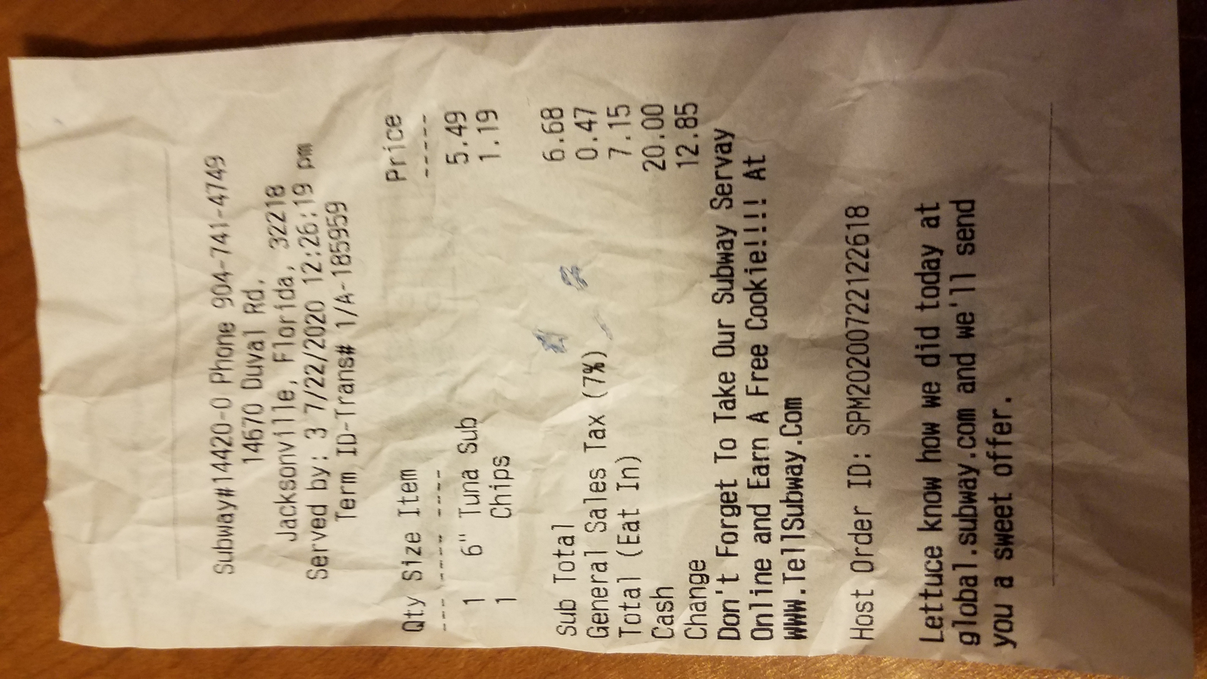 Ordered a tuna sandwich. Noticed it had a slight watery look. Took sandwich home. Did not smell bad but did look watery. Had no bad smelll but did not have that strong tuna smell.