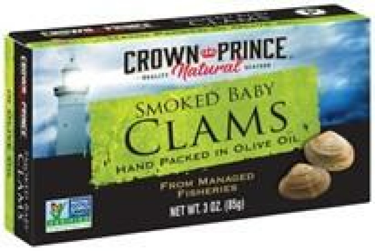 Crown Prince Natural Smoked Baby Clams in Olive Oil Product of China 3 oz can Can UPC – 0 73230 00853 5