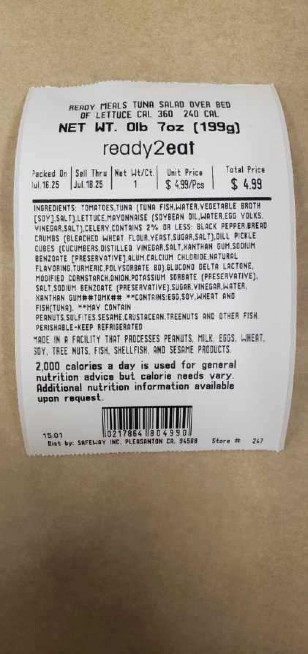 5) PRODUCT: RM TUNA SALAD OVER BED OF LETTUCE SS