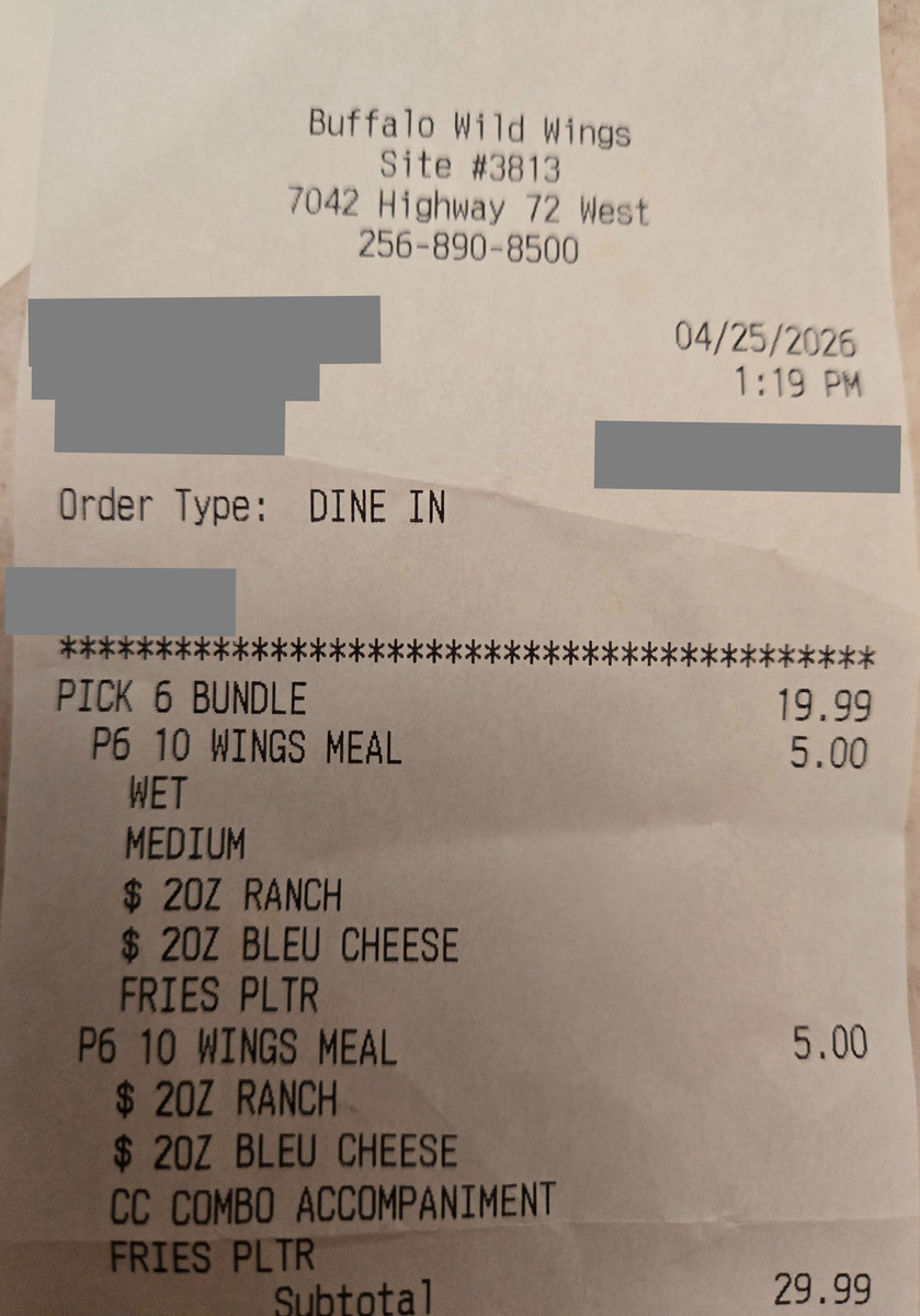 04/25/2026 1:00 p.m. CDT Not sure. Initially thought it was bad Bleu Cheese Dip because the first two people in our group had that in common with each other but not with the other four persons Later. A third person became sick. She did not have the Bleu Cheese Dip but did have bone-in wings. Fourth adult in our party had bone-in wings and has not had symptoms as of 7:00 p.m. CDT Reported details of illness to Manager On Duty Marissa (no last name offered). She reported to Buffalo Wild Wings Corporate and said Human Resources would contact us in 2-3 days. Seems weird that cases of food poisoning would be reported to Human Resources. Edit: The three adults who were sickened had BOTH the bone-in wings AND RANCH DIPPING SAUCE. | Symptômes: Autre, Vomissements, Nausée, Diarrhée, Douleur d'estomac