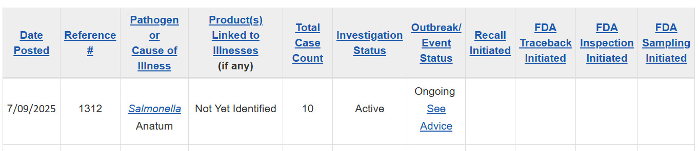 For the Salmonella Anatum outbreak (ref #1312), the investigation has advanced. Chetak LLC Group has issued a recall of Deep-brand frozen sprouted moth (mat) and moong (mung) beans, which have been identified as potentially linked to the illnesses. The FDA has also issued an advisory with additional product details to inform consumers and help prevent further cases. Health officials continue to monitor the situation and conduct traceback efforts.