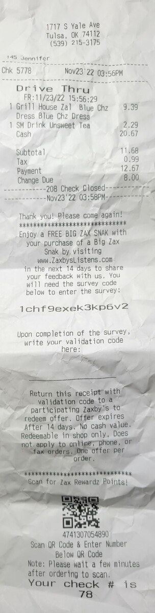 Ordered grilled chicken house salad and unsweet on Nov 23. Stomach was gurgling about 30 min later and shortly after had bad diarrhea. Straight liquid. Called and complained. GM called…