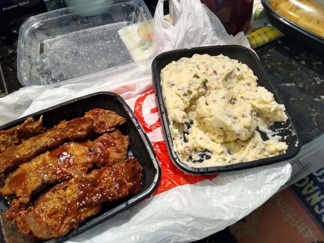 catered in riblets coleslaw mashed potatoes, my husband said the cole slaw to him had tasted weird.