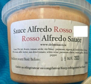 受影响的产品是Rosso阿尔弗雷多酱,500毫升,最佳食用期限2023年11月9日。该产品装在带有透明卡扣盖的塑料容器中,以冷冻方式销售。除了产品名称外,产品标签上还印有"www.delmonaco.ca"字样,并在位于魁北克省柯克兰圣查尔斯大道2968号的DelMonaco销售至2023年5月24日。