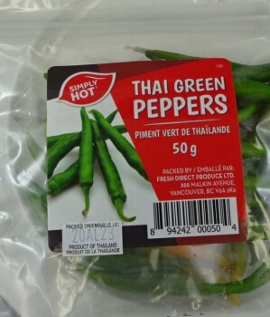 品牌:Simply Hot,产品:泰式青椒,规格:50克,UPC:8 94242 00050 4,代码:包装日期:20AL23